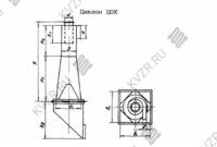Циклон пылеуловитель ЦОК 2 с обратным конусом состоит из корпуса с входным патрубком, внутреннего конуса, выхлопной трубы и пылесборника. Пылесборник может быть в виде бункера или выдвижного ящика. Короткая часть цилиндрического корпуса переходит в расширяющийся книзу конус, непосредственно присоединяющийся к пылеприемному бункеру. При установке агрегата на кронштейне бункер имеет коническую форму, а к пылевыпускному отверстию может подсоединятся затвор типа «мигалки» или шиберный затвор. Рекомендуется установка на кронштейне аппарата диаметром не более 300 мм. Для повышения эффективности пылеосаждения и предохранения осевшей пыли от взмучивания и уноса из бункера в нижней части агрегата устанавливается внутренний конус. Угол при основании внутреннего конуса зависит от рода и характера осаждаемой пыли: для сухой пыли — 45°, для сажи и талька — 60°.